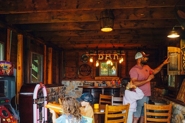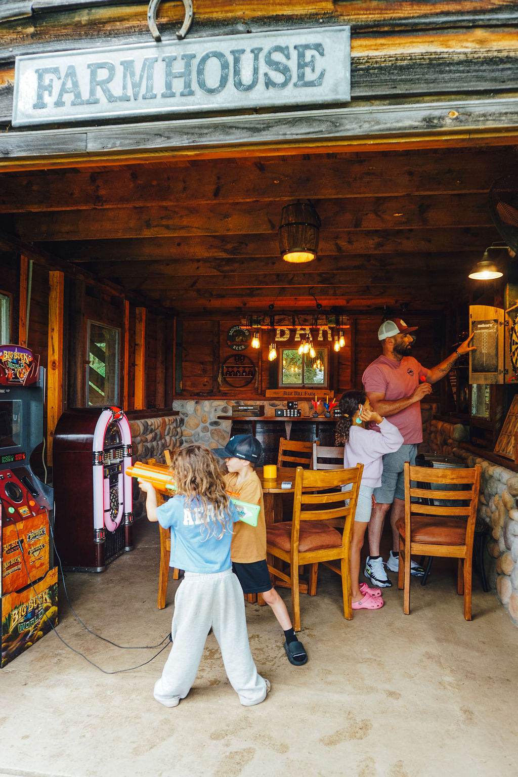 ⭑ "Disco" party barn featuring a disco ball, bar, karaoke setup, jukebox, and arcade games including Mrs. Pac Man and Big Buck Hunter 🪩 🎤 🕹️
