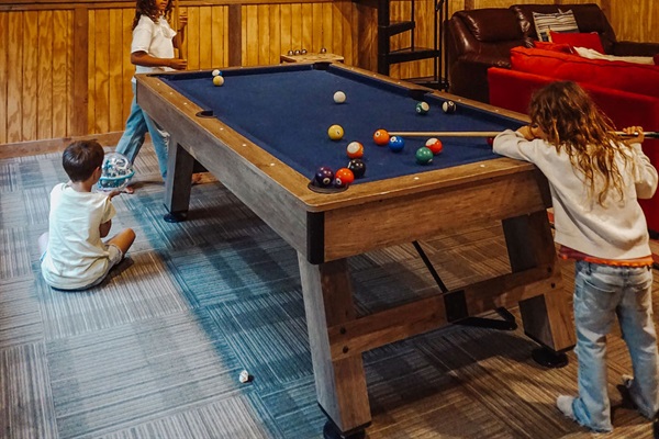 ⭑ Game room with vintage-style arcade games such as Mrs. Pac-Man, pool table, dart board, smart TV, and "last call" dry bar 🕹️ 🎱 🎯